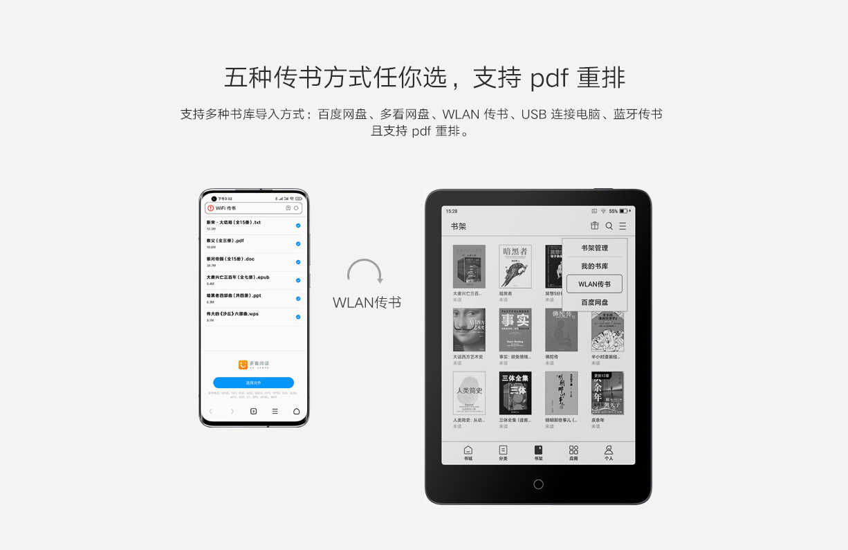 .txt, .epub, .pdf, 및 마이크로소프트 오피스 문서를 스마트폰과 같은 망에 있을 때 바로 전송할 수 있다.